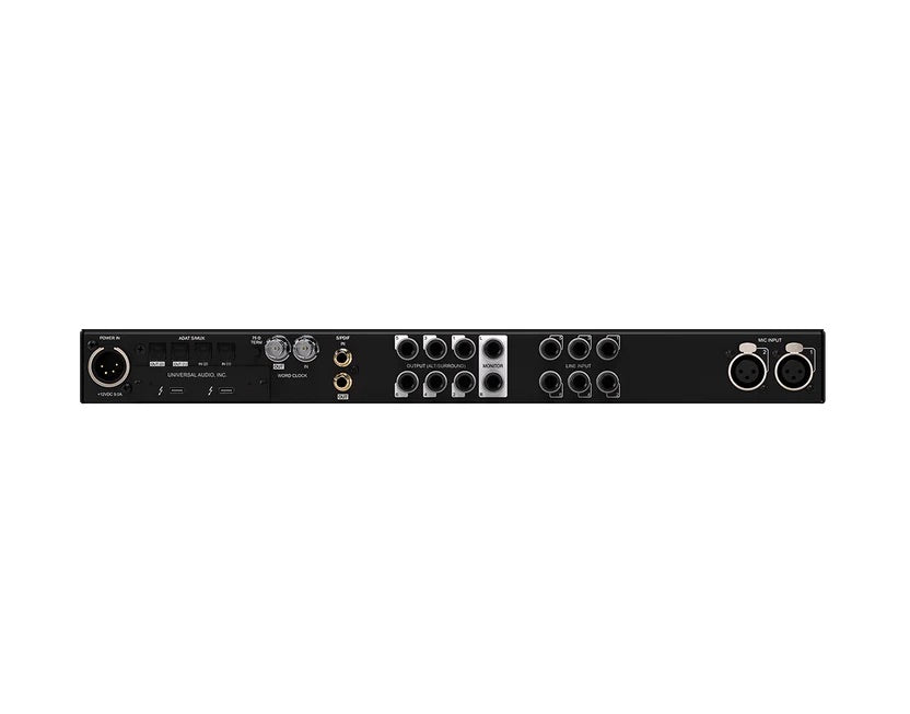 - Two Unison™ mic preamps, two Hi-Z instrument inputs, six 1/4" line inputs, two optical Toslink I/O (ADAT S/MUX), RCA coaxial I/O (S/PDIF), word clock I/O (BNC)